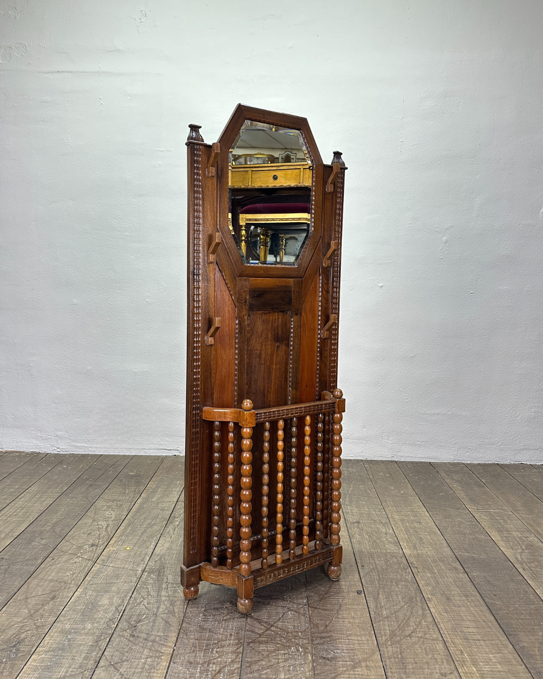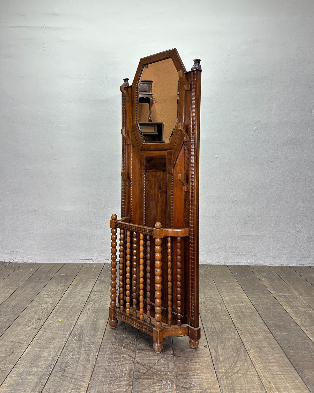 Criada por um artista anônimo, esta chapeleira carrega a tradição do mobiliário brasileiro dos anos 30, unindo estética e funcionalidade.