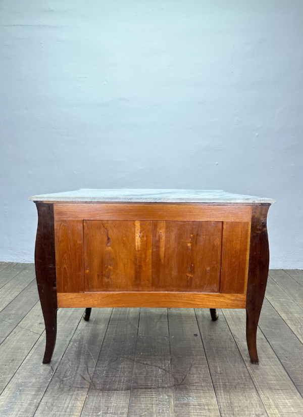 Acabamento: A peça apresenta uma combinação luxuosa entre o Mármore, que confere uma superfície sólida e de alto brilho, e a madeira de Imbuia, que destaca sua textura natural e suas tonalidades quentes. O contraste entre os materiais oferece um equilíbrio entre robustez e sofisticação, com um toque de refinamento característico do período.