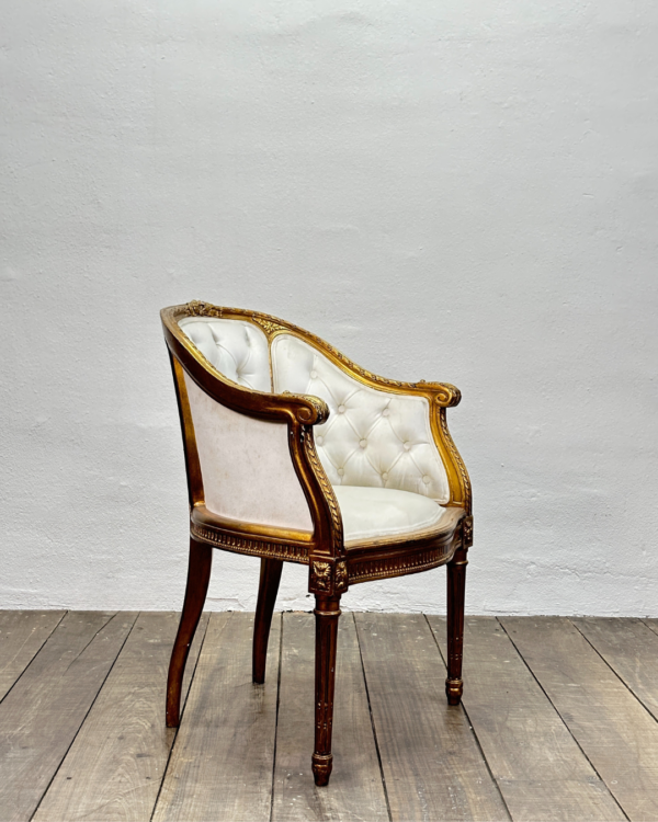 A Poltrona Luiz XVI Off White é uma peça que combina a sobriedade do estilo clássico com um toque contemporâneo. Produzida pelo artista Anônimo, apresenta estrutura em Imbuia com acabamento em tom off-white, ideal para ambientes que valorizam elegância e conforto.