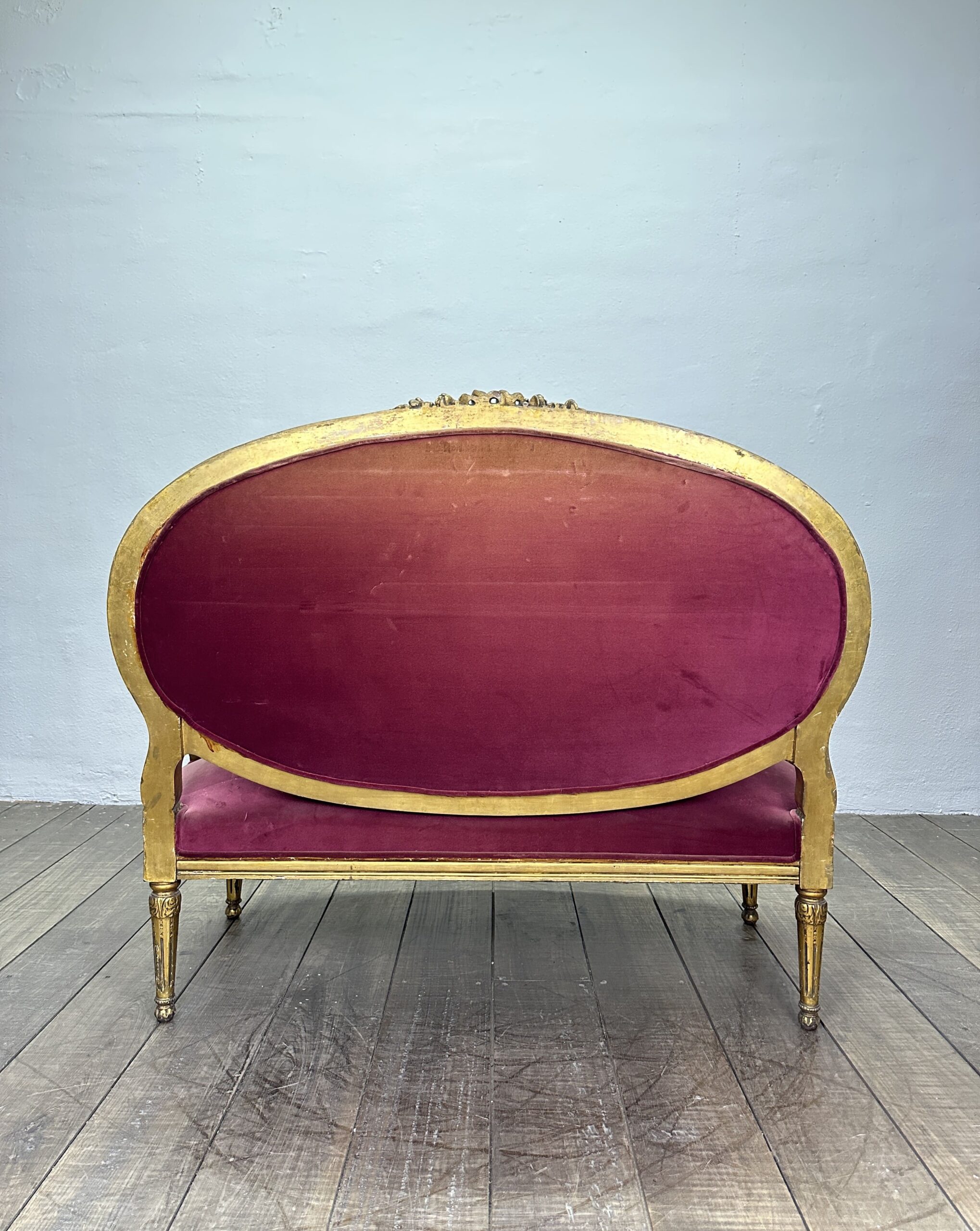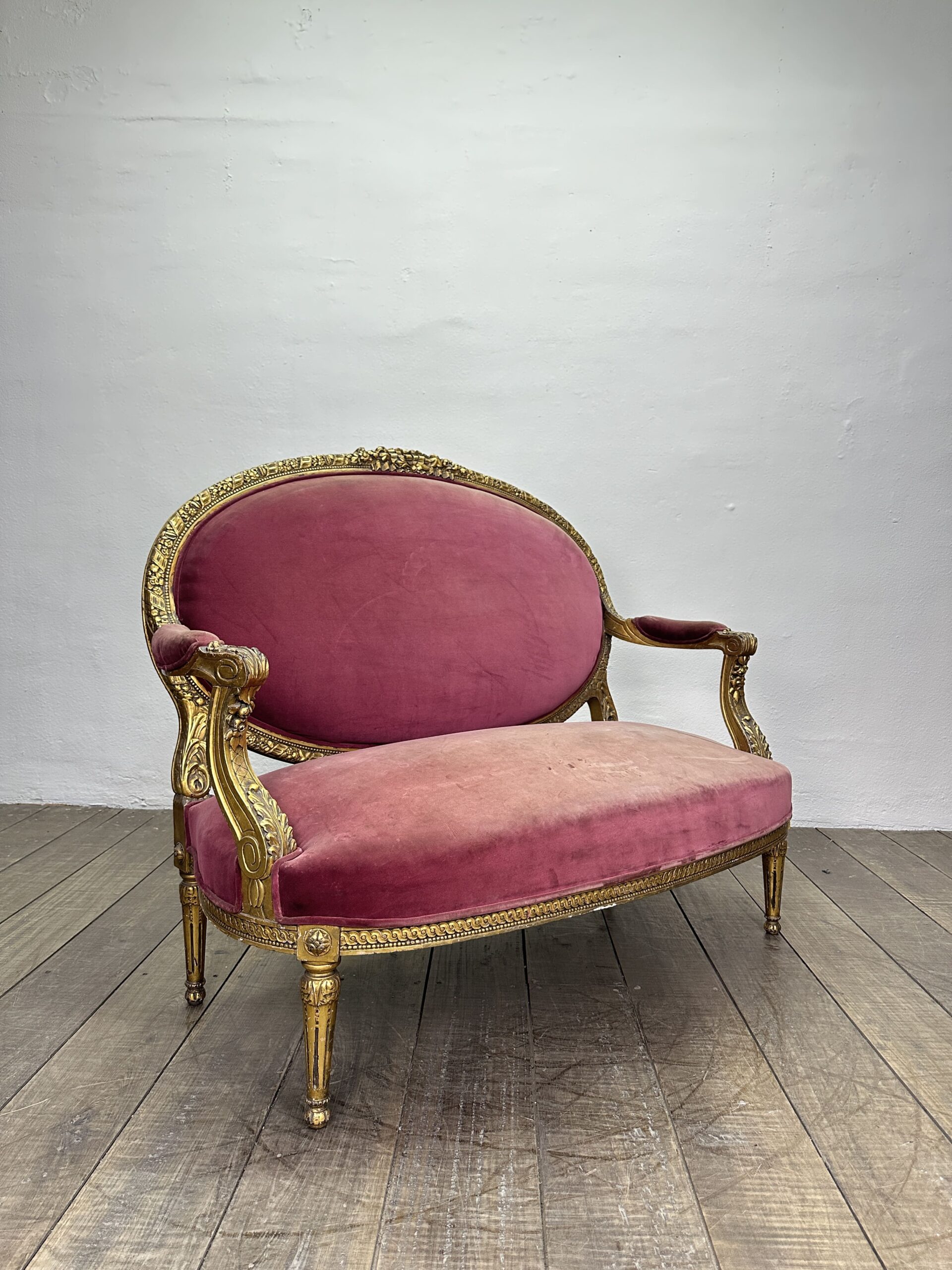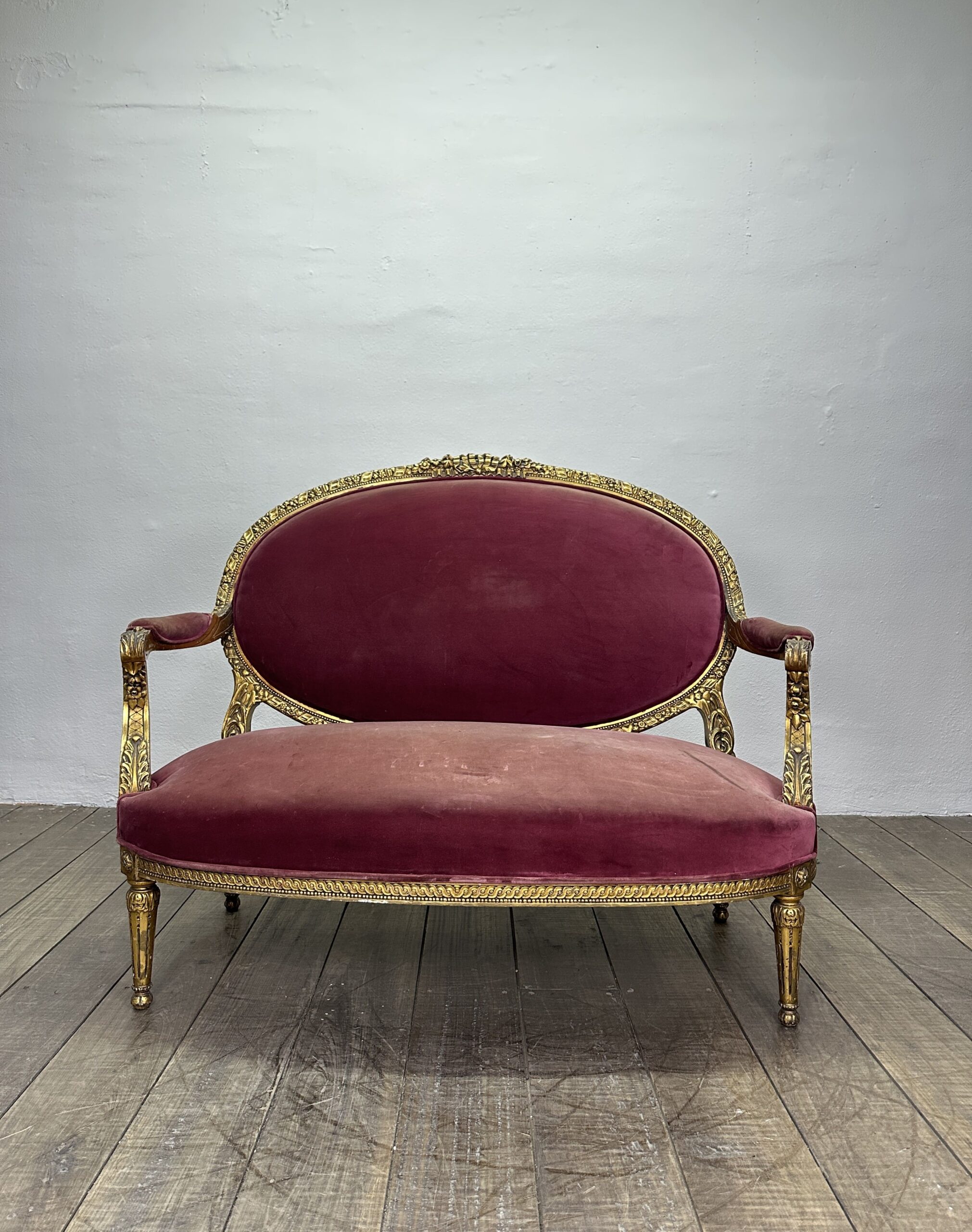 Criado por um artista anônimo, este sofá segue a tradição do mobiliário Luiz XVI, famoso por sua elegância e atenção aos detalhes esculpidos na madeira.