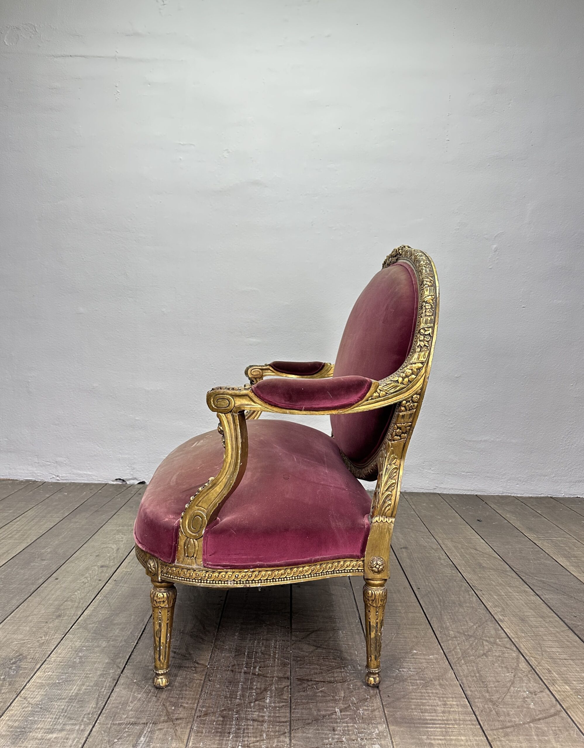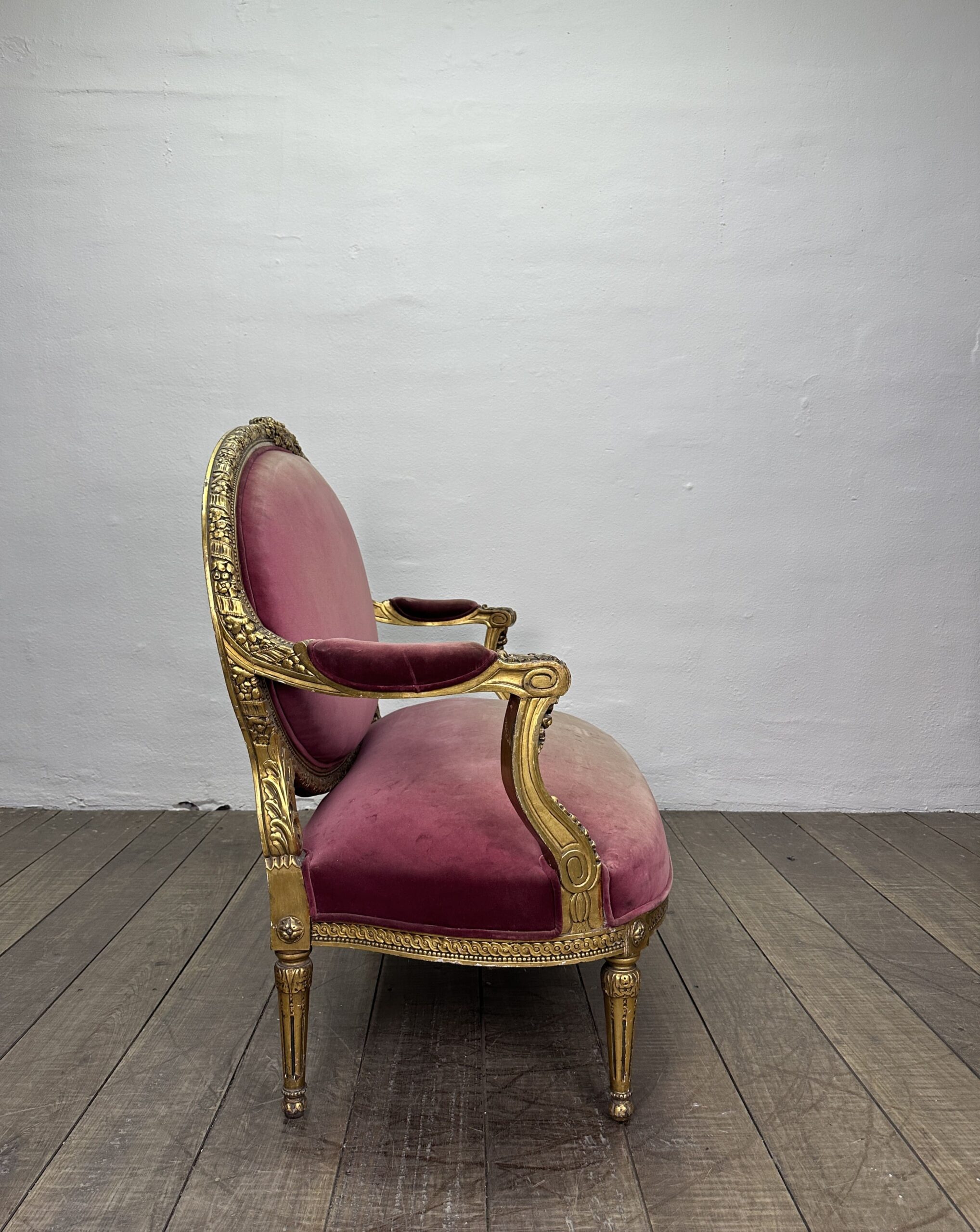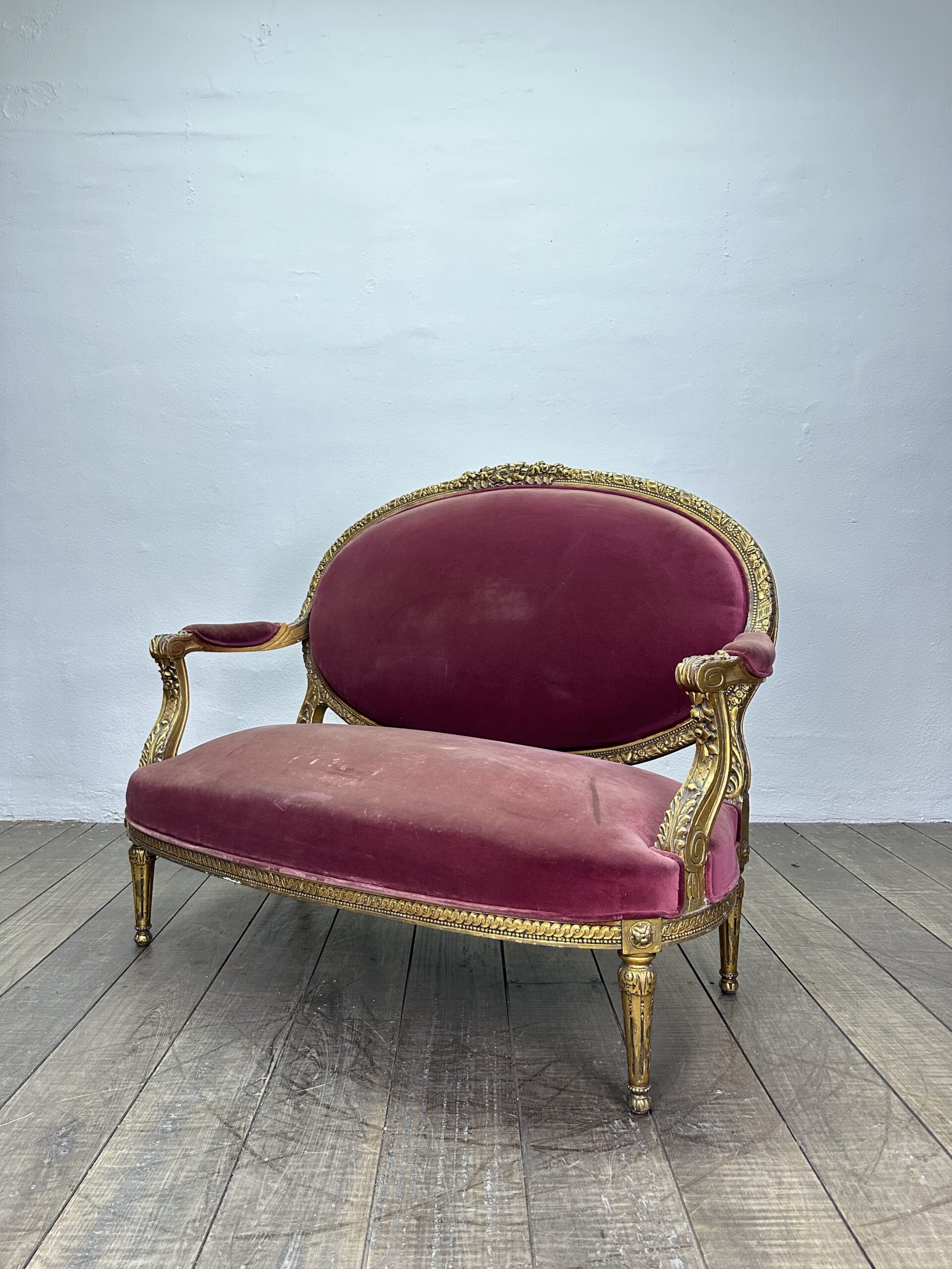 Criado por um artista anônimo, este sofá segue a tradição do mobiliário Luiz XVI, famoso por sua elegância e atenção aos detalhes esculpidos na madeira.
